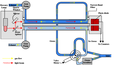 意大利ETG公司的在線式EDK7100型臭氧分析儀,基于紫外光源的朗伯比爾 Beer-Lambert定律,當(dāng)254nm紫外光通過臭氧氣體樣品腔室時(shí)被臭氧吸收,吸收值與臭氧濃度遵循朗伯比爾定律,通過測量吸收前和吸收后的紫外光信號(hào)的變化值,與參考光源進(jìn)行比對計(jì)算,并分析出被測臭氧的濃度值。