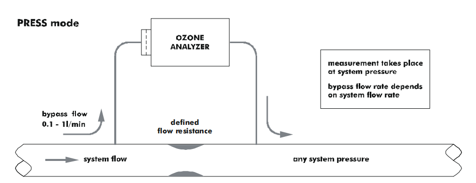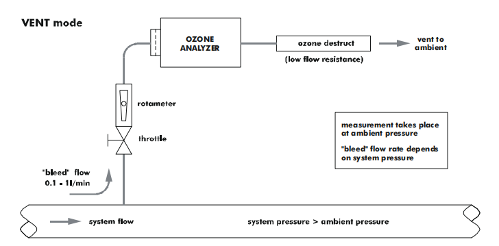 當(dāng)系統(tǒng)低流速較高時(shí),例如在每分鐘 1 到 10 升之間, 很好的解決方案是將臭氧分析儀旁路連接到臭氧管路中的小流阻。在這個(gè)流動(dòng)阻力下的壓降應(yīng)該在幾毫巴的數(shù)量級,以允許足夠的樣氣流過分析儀。